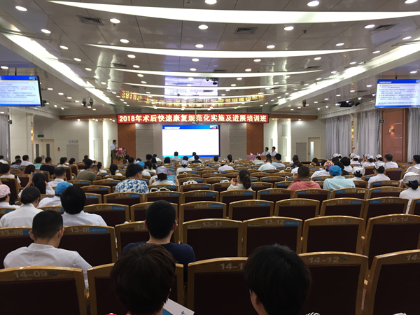 2018年7月12日下午14点会议准时在河北医科大学第二医院会议室举行,来自河北省各个医院的医护工作人员纷纷来到会场,签到人数172人。首先,由相关领导致辞,然后由河北省二院李增宁、刘雅与南京总医院王刚、夏灿灿四位专家分别对《ERAS的营养管理探讨》、《从ERAS角度谈围术期液体治疗》、《加速康复外科围手术期处理在胃肠手术中的应用》、《加速康复外科与护理创新》四个课题进行了深入的讲解。会议秩序良好,会中四位专家还进行了现场互动问答,参会人员积极踊跃参加。最后授予参会人员继续医学教育学分,会议圆满结束。