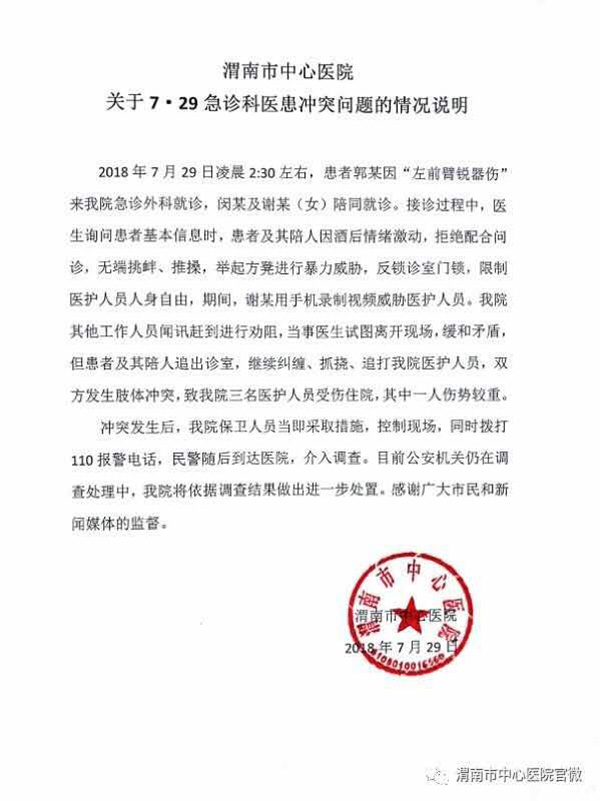 澎湃新闻了解到,渭南市中心医院30日在官网发布《渭南市中心医院关于7·29急诊科医患冲突问题的情况说明》,该说明称,29日凌晨2时30分许,患者郭某因“左前臂锐器伤”来医院急诊外科就诊,闵某及谢某(女)陪同。接诊过程中,医生询问患者基本信息时,患者及其陪人因酒后情绪激动,拒绝配合问诊,无端挑衅、推搡,举起方凳进行暴力威胁,反锁诊室门锁,限制医护人员自由,期间,谢某用手机录制视频威胁医护人员。院方其他工作人员闻讯赶到进行劝阻,当事医生试图离开现场缓和矛盾,但患者及其陪人追出诊室,继续纠缠、抓挠、追打,双方发生肢体冲突。该说明提到,三名医护人员受伤住院,其中一人伤势较重。