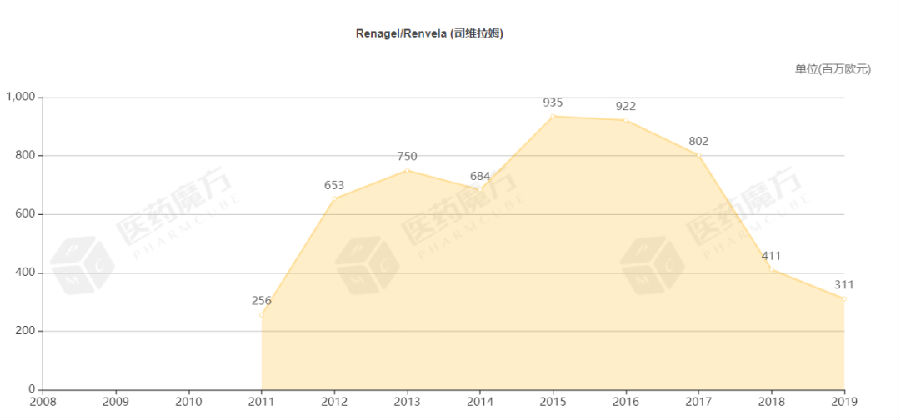 国内目前上市的终末期肾病透析患者高磷血症治疗的药品主要有司维拉姆和碳酸镧。IQVIA数据显示,2018年上述两款药品在中国境内的销售额约为3.53亿元。