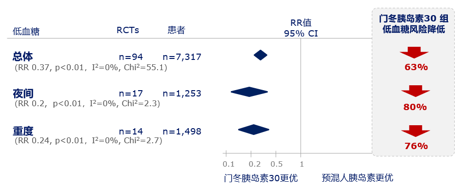 安全性方面,与预混人胰岛素相比,诺和锐® 30显著降低总体、夜间和重度低血糖风险分别达63%、80%和76%(P值均<0.01)(图3);