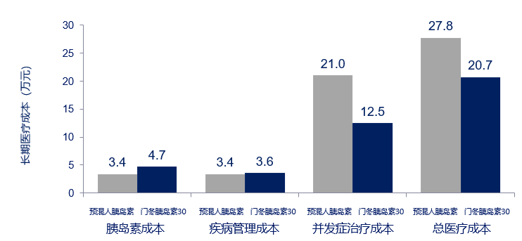 那药物经济学方面如何?根据A1chieve研究中国亚组(n=1,191例)的数据[19],采用药物经济学模型评估长期成本效果可以发现,与预混人胰岛素相比,诺和锐® 30不但提高患者预期寿命和质量调整生命年,还可节约长期医疗总成本25%——主要来自管理并发症成本的降低(图4)。