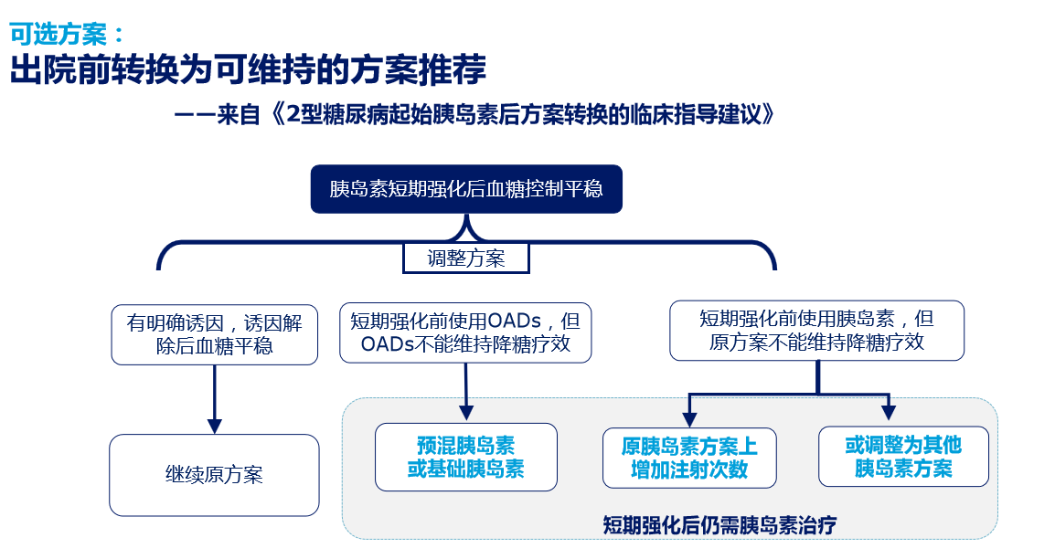 《建议》6指出:1)对于短期强化前使用多种口服降糖药(OADs)、但原方案不能维持降糖疗效的患者,大多需继续胰岛素治疗,出院后建议调整为预混胰岛素或基础胰岛素方案。2)对于短期强化前已使用胰岛素、但原方案不能维持降糖疗效的患者来说,出院后可在原来胰岛素方案上增加注射次数或调整为其他胰岛素方案6。