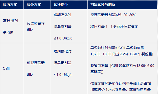 国内外多项RCTs研究7,8,9,10显示,相较基础胰岛素方案,门冬胰岛素 30 BID同时补充基础和餐时胰岛素,兼顾空腹与餐后血糖控制,可以有效降低HbA1c,同时安全性良好;从长远来看,预混胰岛素一支笔一种胰岛素,长期治疗更具经济成本效益,患者的依从性更好、满意度更高11,12,13。对此,《建议》6指出:对于后需要继续胰岛素治疗的患者,如果院内强化方案胰岛素日剂量≤1.0U/kg,可以选择转换为预混胰岛素BID,具体的转换方式为:1)由基础-餐时方案转换为预混胰岛素BID,可在原胰岛素日总剂量的基础上减少20%~30%,再按照1:1分配于早晚餐前注射;2)由CSII调整为预混胰岛素BID,早餐前注射剂量=[CSII早餐前剂量+(6:00~18:00的基础率)+CSII午餐前量],晚餐前剂量=[CSII晚餐前剂+(18:00~6:00基础率)] ,依临床情况决定在此剂量基础上是否增加或减少10~20%剂量,或维持原剂量。(表1)6