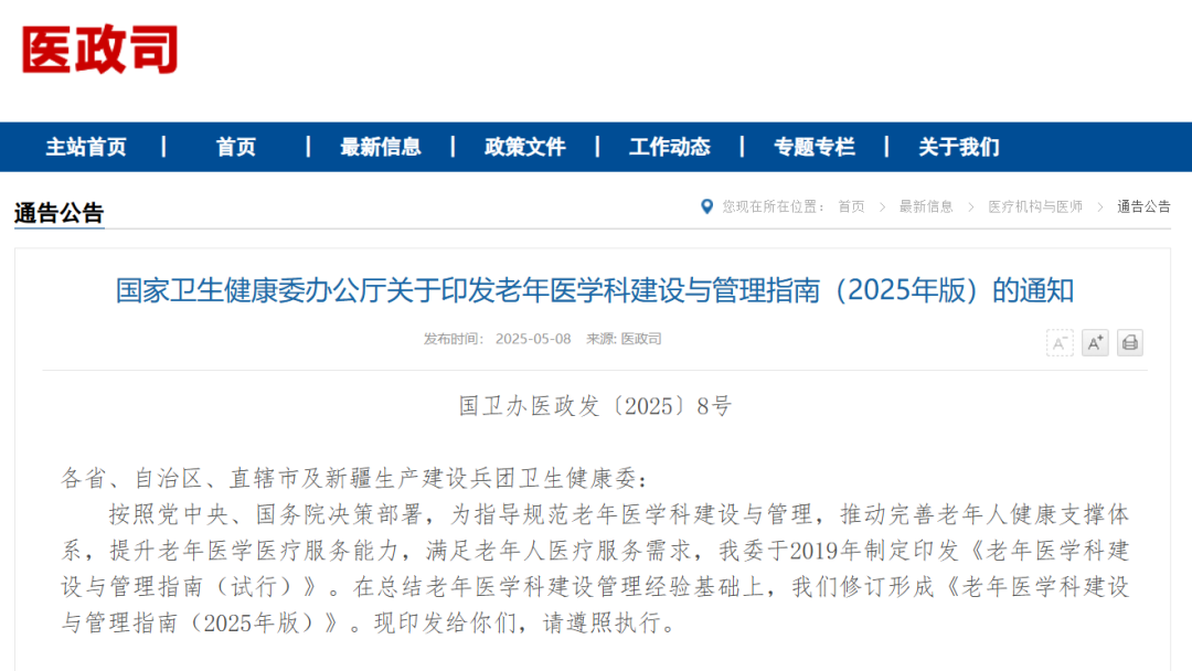 5月8日,国家卫生健康委发布《老年医学科建设与管理指南(2025年版)》(下称《指南》),明确要求有条件的二级及以上综合医院开设老年医学科,并细化了设置标准、服务模式及人员配备等内容。